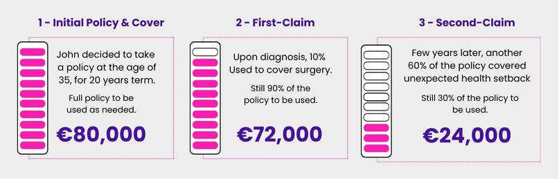 Multi-Claim Protection Cover is designed to provide comprehensive financial support in the event of serious health issues by paying out a portion of the total coverage amount as needed. Here’s how it works, illustrated through John’s experience: